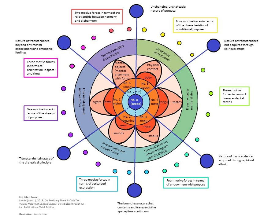 Vereinfacht gesagt bedeutet das, dass zum Beispiel eine "Kaffeetasse" erst dadurch "existiert", dass ihre physische Form von uns wahrgenommen, benannt und bewertet wird. Das ist der Grund, warum der Yogacara-Buddhismus lehrt, dass alles "Consciousness-Only" (engl.: "Alles nur Bewusstsein") ist: Denn ohne die Verarbeitung durch die acht Bewusstseinsarten könnten wir weder die Kaffeetasse, noch den Kaffee darin "erleben". Daraus folgt, dass es keine dhammas (wörtl.: Phänomene) gibt, die wirklich außerhalb und unabhängig vom Bewusstsein existieren. Alle kognitiven Prozesse basieren auf dem Zusammenspiel der acht Bewusstseinsarten, allerdings gibt es zahlreiche Faktoren, die mit hineinspielen, indem sie mal dieses, mal jenes Bewusstsein fördern, oder hemmen. Die Cheng Wei Shi Lun (eine chinesische Kernschrift des Yogacara) listet insgesamt 100 Faktoren auf, die zusammenwirken und so unser "Erleben" der Welt gestalten. Es ist ein hochkomplexes Modell, das wir hier nicht im Detail ausführen wollen; wenn du jedoch neugierig bist, hier ein kleiner Überblick (Grafik in englischer Sprache):